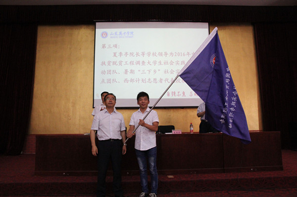 夏季亭院长等校领导为2016年中国扶贫脱贫工程调查大学生社会实践专项活团队、暑期“三下乡”社会实践省级重点团队、西部计划志愿者代表授旗,并为西部计划志愿者代表颁发荣誉证书。学生代表神采奕奕,光荣而神圣地接受了学校领导授予的旗帜,同时也承担起一份沉甸甸的责任。