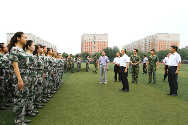 在南北校区各处训练场,学校领导详细询问军训教官、辅导员、参训学生的入学和组训情况,听取了军训教官和二级学院组织开展队列动作、内务规范、作风纪律和大型团体操的筹备情况。夏院长一行视察了各营的训练情况,了解军训开展情况,亲切询问参训教官在新生训练方面有什么困难之处,希望各位教官能配合学院做好学生教育工作,通过军训磨练他们艰苦奋斗的意志,培养学生吃苦耐劳和严谨的精神,为帮助他们尽快适应大学生活导好航、服好务。夏院长还亲切地与2016级新生进行交谈,仔细询问身体状况,鼓励他们要克服困难,在军训中提升自己的意志品质,努力完成军训任务。夏院长同时对新生的表现和吃苦耐劳的坚强意志给予了表扬,并殷切希望同学们通过军训积极学习军人的优良作风,并通过军训增强体质,树立集体意识,锤炼良好品质。