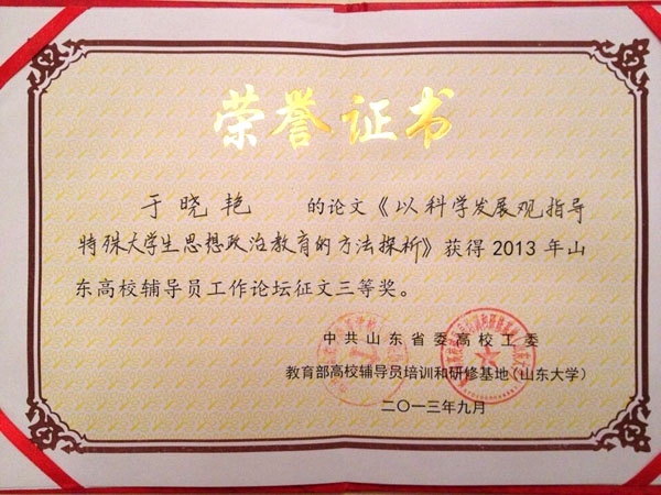 据悉,此次论坛共从全省各高校报送的235篇论文中,评选出一、二、三等奖论文共70篇,365官网学生处共报送组委会5篇论文,经济管理学院辅导员于晓艳的论文在本次论坛中荣获三等奖。
