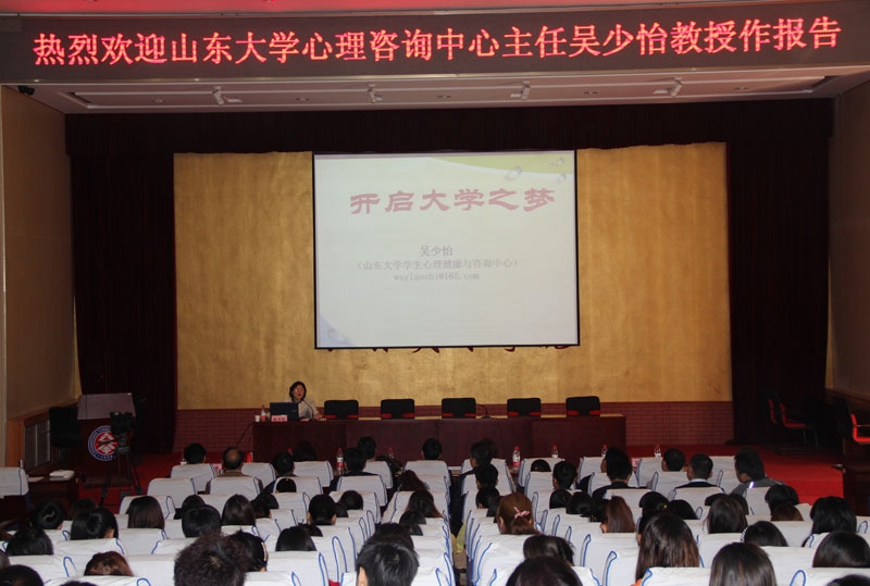 启动仪式结束后,山东大学心理咨询中心主任吴少怡教授为在座的英才学子作了《开启大学之梦》的专题讲座。吴教授引领同学们从“我们的大学之梦”开始启航,通过与现场学生的积极互动,让同学们描述自己对大学生活的感受,帮助大家认识自我、了解自我,从心理学角度引导学生认识到在适应大学生活中可能会出现的问题、障碍,并让学生掌握了更好适应大学生活的方法与原则,鼓励大家要学会适应,迎接挑战。吴教授的讲座材料丰富翔实,视角新颖独特,语言诙谐激扬,令人耳目一新,获益匪浅。会后,同学们纷纷表示吴教授的报告开拓了大家的视野,增长了同学们的心理学知识,启迪了大家的思维,使大家学会重新审视自己,审视大学生活的方向,审视大学学习的目标,从而使自己具有更准确明晰的定位。