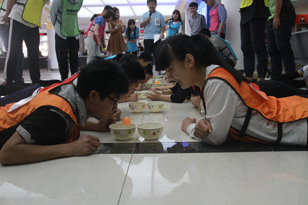 24日下午两点,比赛正式开始。六支队伍摩拳擦掌,跃跃欲试,他们分别给自己队伍起了队名和口号,充满了信心与激情。比赛第一个环节为“跳动的乒乓球”,要求各队队员依次把一个碗里的乒乓球吹到另一个碗中,然后再吹回来,所有队员都完成任务之后,全体队员手挽手奔跑参观两史馆后回到比赛场地内通过抢答问题决出名次,最后一支队伍将被淘汰;第二环节为“趾压板上的歌”,要求队员们在趾压板上唱歌并通过气息把蜡烛吹灭,并且只能一名队员唱歌,其余队员伴舞,共有两次机会,按最优成绩排名,最后一名的队伍淘汰;第三环节为知识抢答。每队有一张A4纸和一支签字笔,通过答题板回答问题。共五道问题,答对最多的队伍获胜,最后一名淘汰。经过层层环节的淘汰筛选,最终海岛队、颜值爆表队、志愿者小分队三支队伍进入最后的撕名牌环节。事务中心五层楼中共14个乒乓球,其中只有3个是真的,最终获得3个真球的队伍获胜。三支队伍可互相撕名牌,每撕敌方一名队员的名牌可获得其找到的乒乓球。各队队员们争分夺秒、团结协作,奋力奔跑,纵然气喘吁吁也挡不住同学们高涨的热情和必胜的决心。最终“海岛队”成为了本次“奔跑吧,英才”活动的最终胜利者。