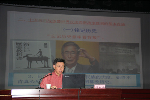 报告会上顾教授首先向同学们讲解了中国抗日战争暨世界反法西斯战争胜利的时代背景。他从正视中俄在世界反法西斯战争胜利中所作的贡献,对警惕挑战战后和平国际秩序的行径和人类必须共同努力才能维护世界和平三方面展开分析。