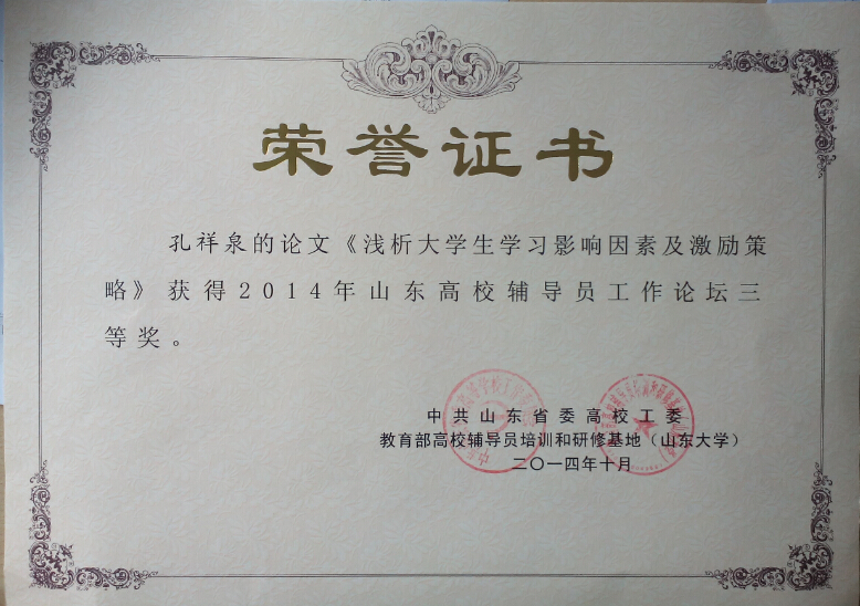 王莉宣读了《中共山东省委高校工委关于2014年山东高校辅导员工作论坛获奖论文的通报》,与会领导为获奖论文作者代表颁发了荣誉证书。