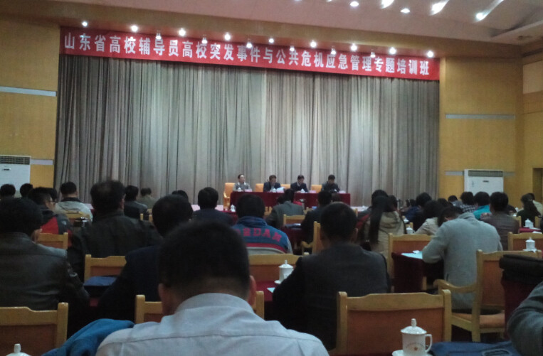 第二期,高校突发事件与公共危机应急管理专题培训班,于2014年11月4日-7日举办,省委高校工委宣教处处长刘欣堂,山东省公安厅国保局副局长李登全,山东建筑大学学工部部长赵明吉,山东政法学院教授李学永,华南理工大学心理咨询与健康教育中心主任、教授黄建榕,济南大学法学院院长、教授杨士.林,山东大学学工部副部长王浩,山东大学文学与新闻传播学院副院长、教授刘悦坦等分别就习总书记系列讲话精神诠释、当前我省高校安全稳定形势与应对、高校危机事件应对与管理、高校突发事件处置中的法律问题、大学生心理危机干预与预防、十八届四中全会精神解读、少数民族大学生思想政治教育管理与服务、高校突发事件处置中的网络舆论监控等方面作了精彩报告。