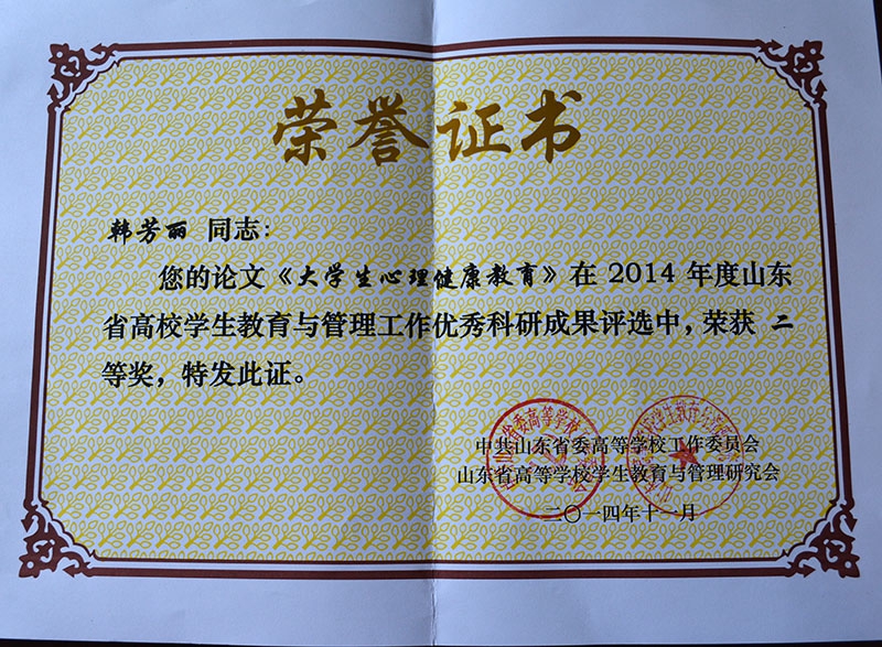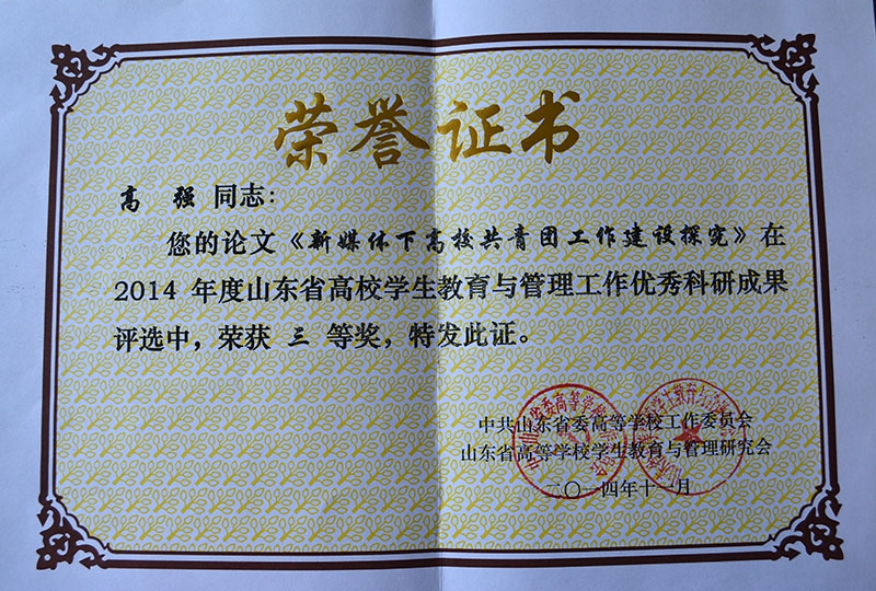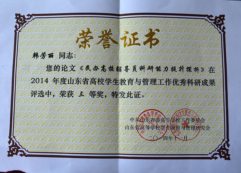 365官网在大会探讨交流环节做了“双线晋升,优化辅导员队伍建设”、“构建大学生心理健康四级网络建设”发言。商学院高强副院长论文《新媒体下高校共青团工作建设探究》、学工部韩芳丽论文《民办高校辅导员科研能力提升探析》获山东省委高校工委“2014年度山东省高校学生教育与管理工作优秀科研成果”评选三等奖;韩芳丽论文《大学生心理健康教育》获得该项评选二等奖。