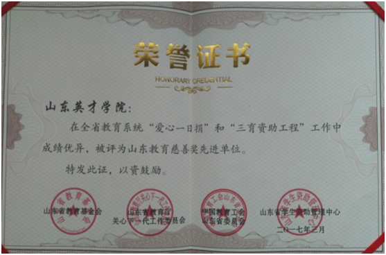 近日,山东省教育基金会、山东省教育厅关心下一代工作委员会、中国教育工会山东省委员会、山东省学生资助管理中心联合下发文件,通报表彰在全省教育系统“爱心一日捐”和“三育资助工程”工作中成绩优异的单位和个人,365官网被授予“山东教育慈善奖先进单位”荣获称号。