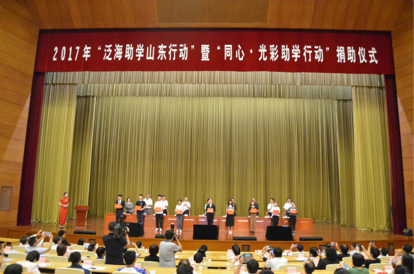 捐助仪式由省委统战部常务副部长赵强主持,山东省委统战部副部长、省工商联书记李法信在会上宣读了《山东省委统战部、泛海公益基金会、山东省光彩事业促进会关于对李健等10000名大学新生和张晓伟等1600名在校大学生进行资助的决定》。随后举行了助学金发放仪式,获得学生代表上台领取助学金并合影留念。徐建兵先生介绍了泛海集团参与公益事业的有关情况,山东财经大学党委书记王邵军作为受助高校代表发言,来自北京大学和山东大学的新生受助代表做了发言,满怀深情的表达了对党和国家、对爱心人士的感激之情,表达了发愤图强、立志成才回报社会的拳拳之心,在座受助学生倍受鼓舞。最后,邢善萍同志作了重要讲话,肯定了我省光彩事业取得的成绩,高度评价了卢志强董事长为“同心•光彩助学行动”“泛海助学山东行动”和“泛海杨帆山东大学生创业行动”所做出的杰出贡献,对各级统战部、光彩会和高等院校深入开展光彩助学行动,进一步谋划好、组织好、发展好光彩事业,鼓励大家积极参与到扶贫开发事业中来。最后,对青年学子提出了四点希望:一是胸怀理想、坚定信念;二是刻苦学习、努力成才;三是坚韧不拔、自立自强;四是胸怀感恩、奉献社会。