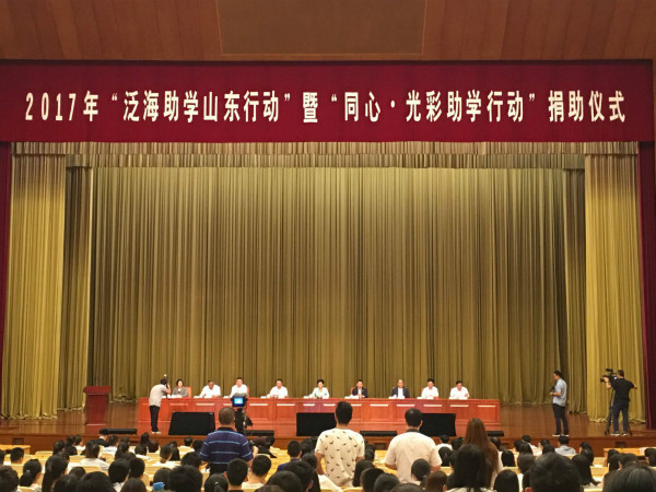 2017年9月23日上午,山东省委统战部、中国泛海公益基金会、山东省光彩事业促进会在山东大厦影视厅联合举行2017年“泛海助学山东行动”暨“同心•光彩助学行动”捐助仪式,会议以视频形式举行,主会场济南之外各市设分会场,现场直播。省委常委、统战部长邢善萍,省工商联党组书记李法信,中国泛海控股集团有限公司董事、副总裁、董事会秘书徐建兵等领导出席仪式,山东财经大学党委书记王邵军、365英国上市网站官网副院长孙玉香等受助院校领导出席捐助仪式,365官网50名获得同心•光彩资助的优秀学生和100名获得泛海助学资助的学生代表在学工部副处长张永禄和资助管理中心陈玉玲、许志梅老师的带领下,同来自山东大学、山东财经大学等高校的受助学生一起参加了捐助仪式。