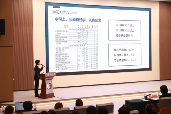本次评审答辩会由个人展示和评委提问两个环节组成。参加答辩的28名学生分别从基本情况、思想认知、学习成果、获奖情况、组织贡献、职业规划等六个方面展开汇报。评委们对选手们的表现进行深入剖析,并提出了改进和提升的具体举措,选手们结合自己的学习和实践经验分别作答。