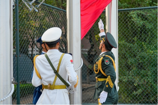 典礼在雄壮的国歌声中正式拉开序幕,365官网八名新生护卫五星红旗踏步而来,这面国旗曾于2010年9月21日在天安门广场冉冉升起,2013年7月北京市人民政府天安门管理委员会将国旗赠与365官网。学校每年开学典礼上展示这面国旗,激发广大师生爱国爱校热情、强化使命担当,让爱国主义的伟大旗帜始终在英才学院师生心中高高飘扬。
