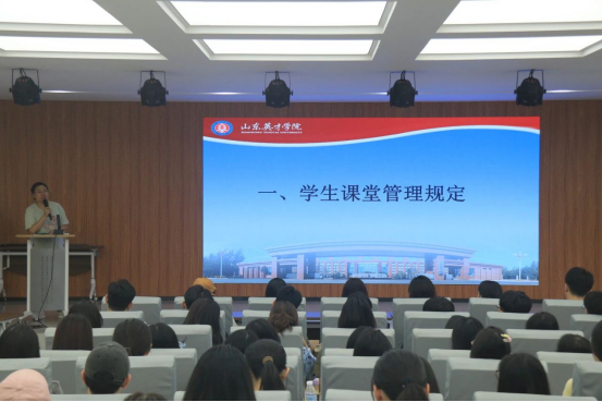 学生工作处杜春茂老师对学校的发展历程及学校文化进行了深入细致的介绍,并解读了学生手册及相关的法律法规,引导同学们要从自身做起,做到讲规矩、立规矩、守规矩,针对学生违纪行为作了举例说明,向同学们明确了违纪上报的流程及材料的填写。他鼓励新生们摆正心态,尽快适应大学生活,遵守学校各项管理规定,在校园中书写属于自己的辉煌。