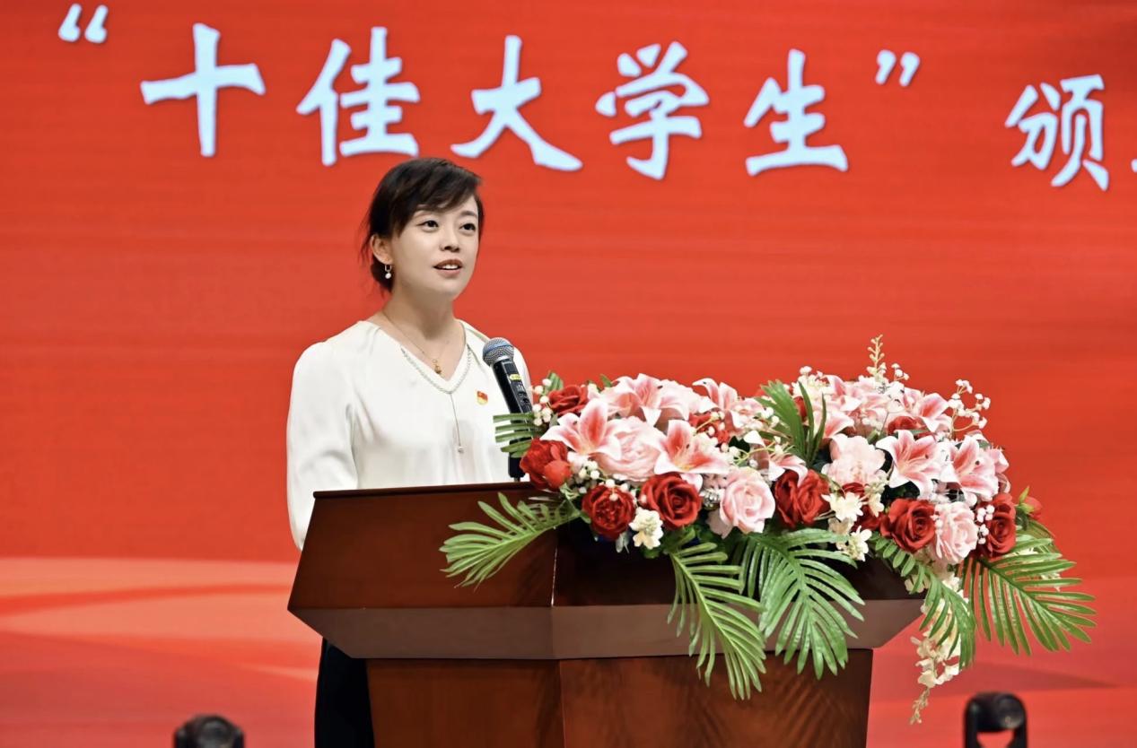 典礼第二项,为“十佳大学生提名”获得者颁奖。在追逐梦想的道路上,这些同学以扎实的学识、积极的态度奋勇向前,展现了当代大学生的风采。主持人轮流宣读颁奖词,背景同步播放每位学生的视频,随后,执行校长王晓娜为提名奖获得者颁发荣誉,现场掌声雷动,这是对他们努力的认可与鼓励。