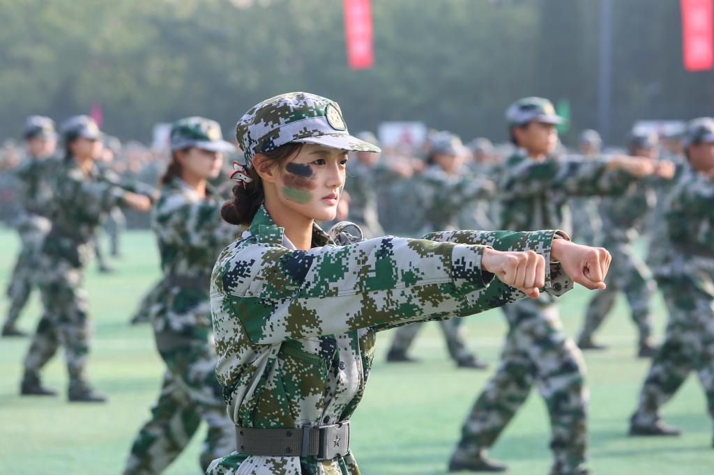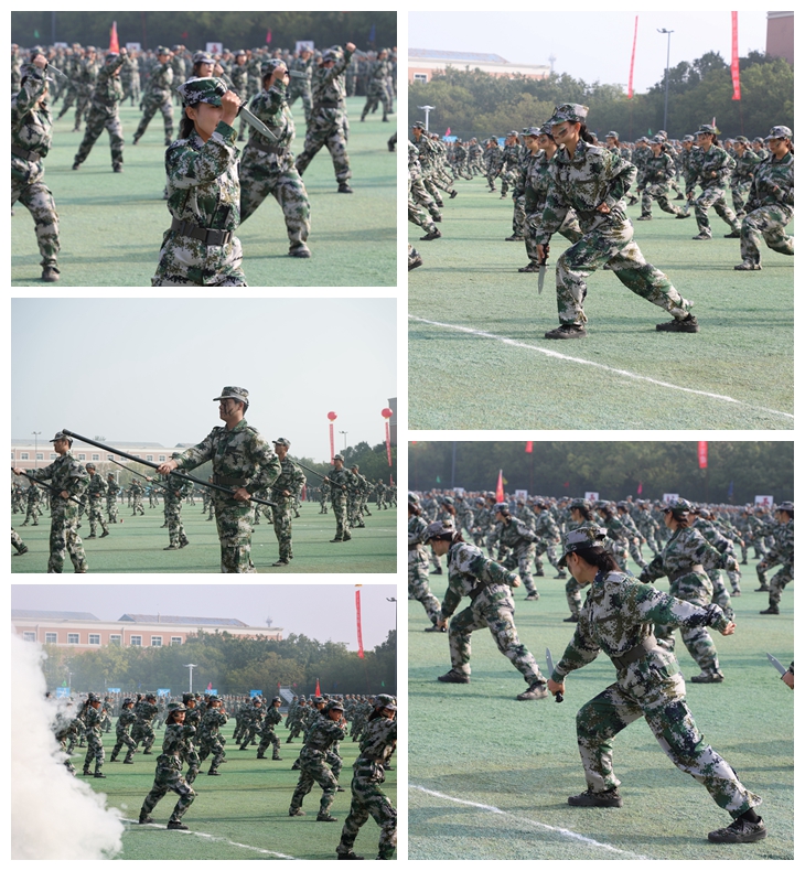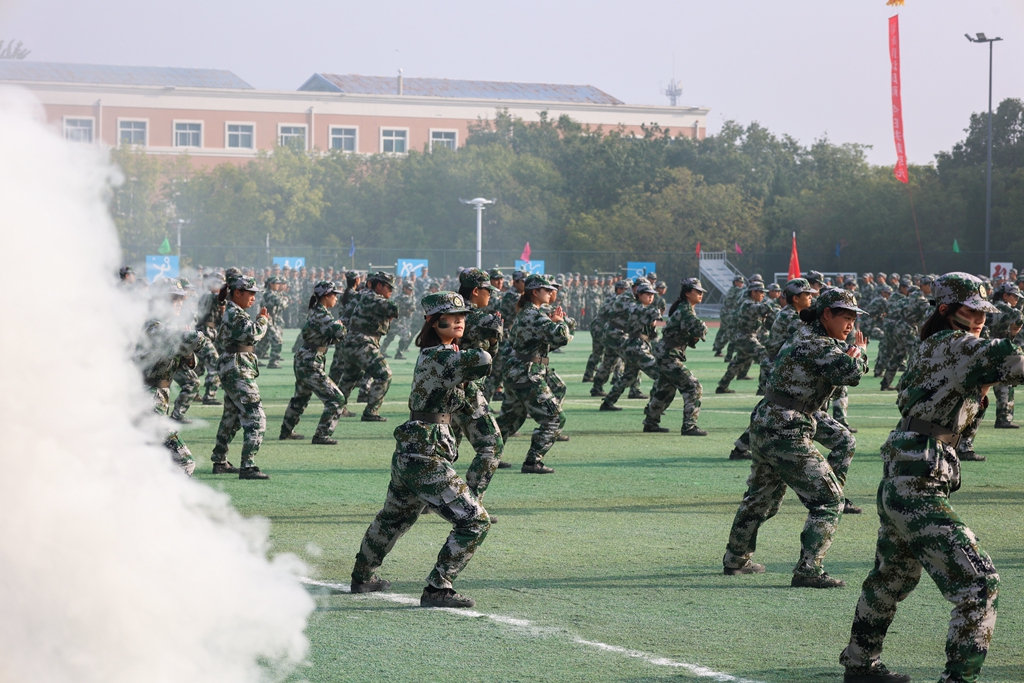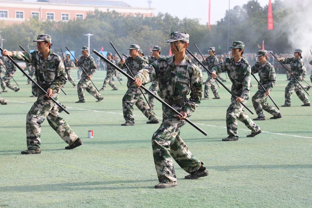 2025级新生身着迷彩服,国旗方队、校旗方队、各二级学院方阵依次列队,迈着铿锵步伐,喊着嘹亮口号,昂首挺胸通过主席台,他们身姿挺拔、动作标准、队列整齐,展现出军训磨砺的坚韧意志与昂扬风貌。分列式后,表演方队进行了擒敌拳、警棍盾牌操、旗语操等军训科目表演,一招一式尽显飒爽英姿。