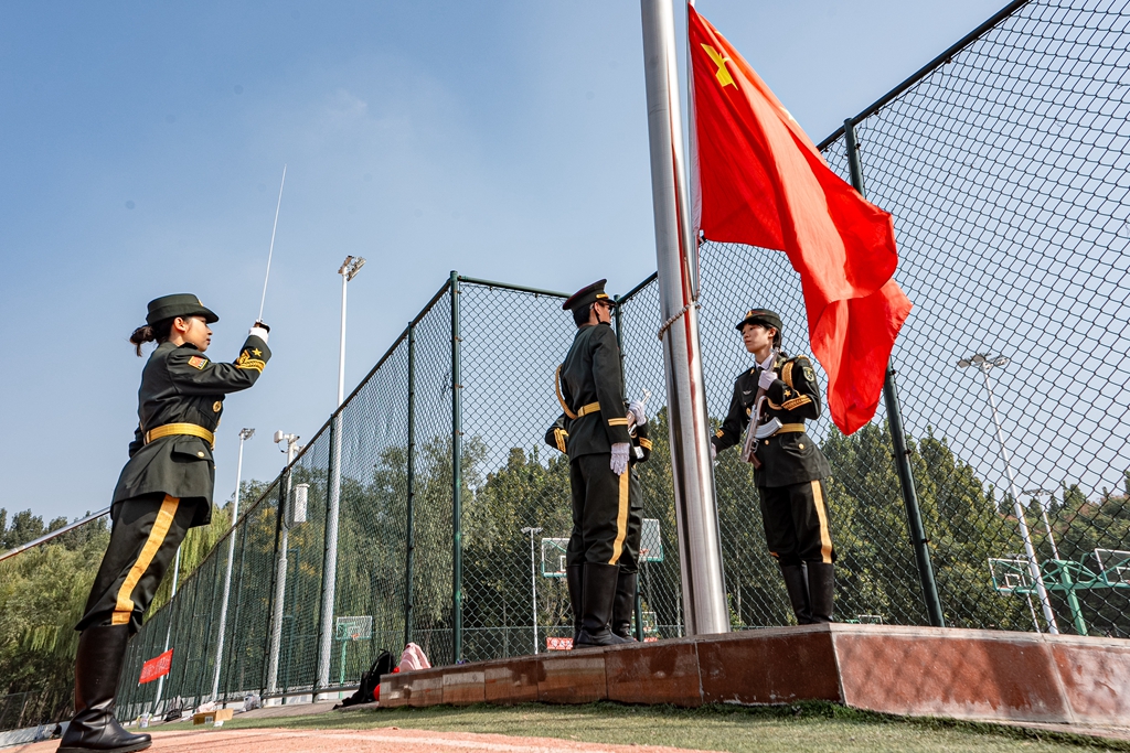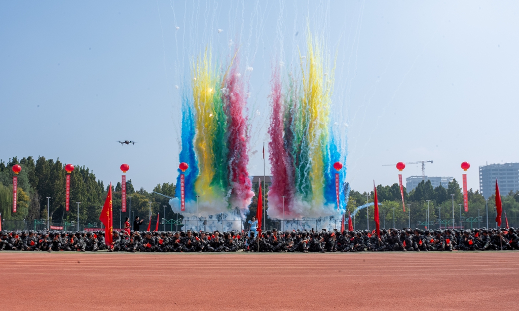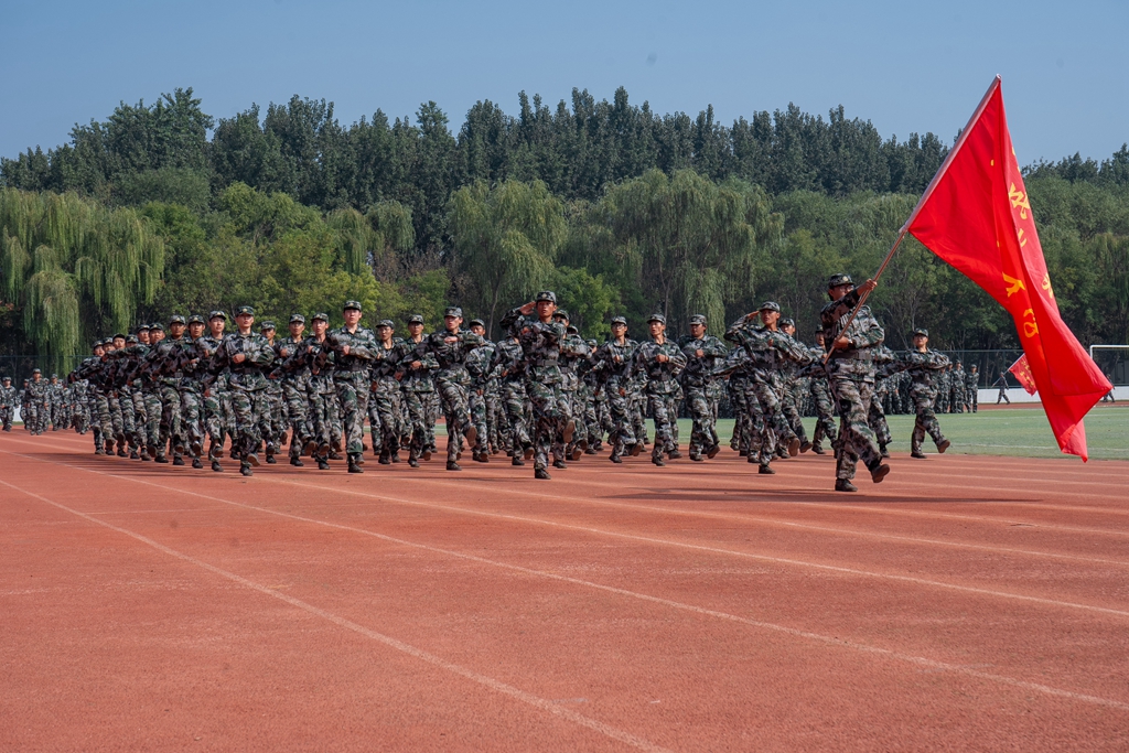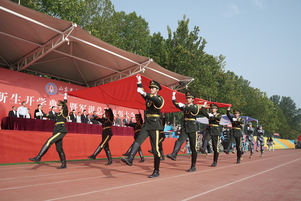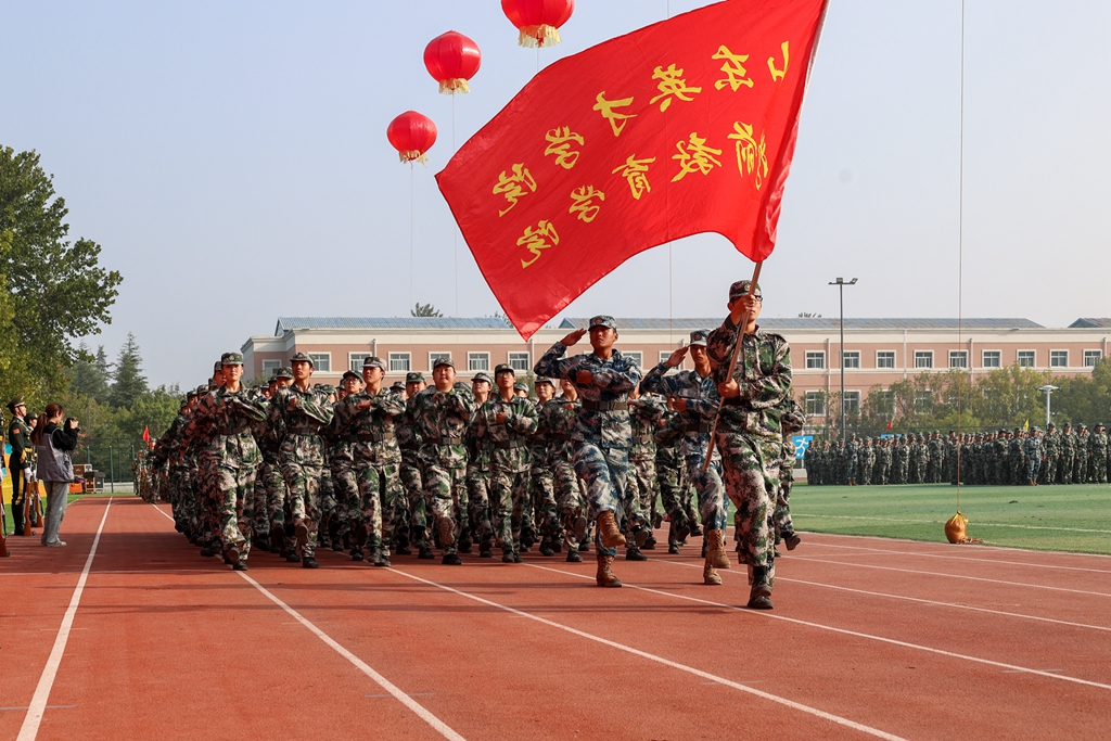 新生开学典礼暨军训总结表彰大会在庄严肃穆的国歌声中拉开帷幕。伴随着雄壮的《义勇军进行曲》,五星红旗冉冉升起,场内师生面向国旗肃立,齐声高唱,爱国情怀在田径场上空激荡。