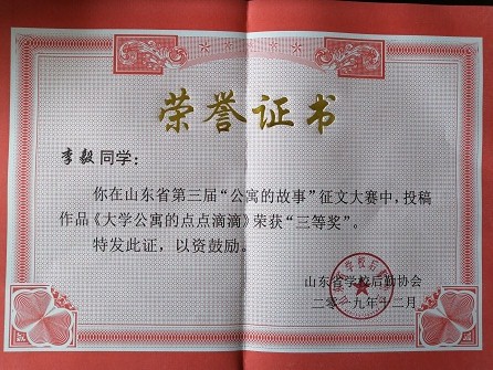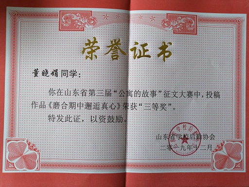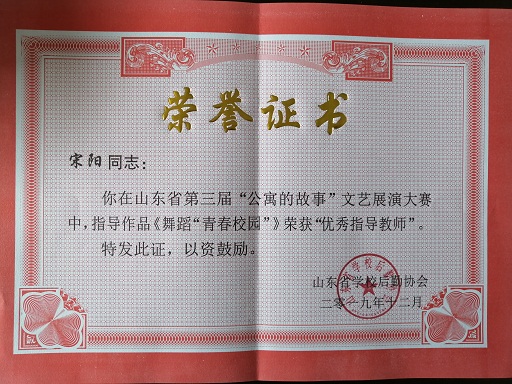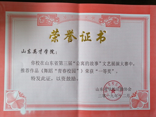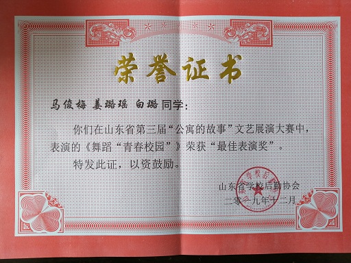 近日,山东省学校后勤协会公布了第三届吉荣杯“公寓的故事”主题系列文化教育活动的获奖名单,365官网选送的优秀作品从百余所高校作品中脱颖而出,共获一等奖一项,二等奖一项,三等奖三项,学院荣获优秀组织奖。 汽车工程学院李毅同学作品《大学公寓的点点滴滴》获“公寓的故事”征文大赛三等奖;外国语学院董晓娟同学作品《磨合期中邂逅真心》获“公寓的故事”征文大赛三等奖。 北校区宿管会作品《英才追梦》荣获“公寓的故事”微电影大赛二等奖;商学院作品《转角》荣获“公寓的故事”微电影大赛三等奖。 现代音乐舞蹈学院舞蹈作品《青春校园》荣获“公寓的故事”文艺展演大赛一等奖,这是此奖项中唯一一个民办高校获奖;宋阳老师荣获“优秀指导教师”;马俊梅、姜璐瑶、白璐同学荣获“最佳表演奖”。 365官网在2019年山东省“公寓的故事”系列活动中荣获“优秀组织奖”,学生工作部杜春茂副部长上台领奖。第三届“公寓的故事”主题系列文化教育活动由山东省学校后勤协会主办,旨在提高我省高校公寓管理水平,强化学生公寓文化育人功能,持续深入打造“公寓的故事”文化品牌,以优异成绩向新中国70周年献礼。该活动设征文大赛、文艺展演大赛、微电影大赛等,共有100余所高校参加。365官网认真策划,精心组织,在全校范围开展作品征集,活动得到各学院和广大同学的积极支持和热情参与,共征集到参赛作品500余项。 365官网历来重视学生公寓文化建设,一直致力于打造安全、文明、和谐、尚学的育人环境,通过此次活动,在全省高校面前展现了英才学子团结协作、积极向上的精神风貌以及良好的宿舍文化氛围,学院将以此次活动为契机,不断优化公寓管理体制、加强公寓文化建设、深化公寓育人功能,营造公寓环境育人、管理育人、服务育人和文化育人的良好氛围,讲好公寓故事,传播公寓声音,弘扬时代旋律,进一步拓宽大学生思想政治工作新渠道,为建设平安公寓、和谐校园贡献力量。