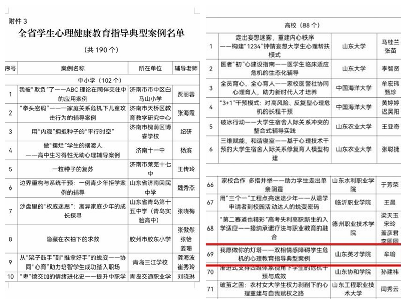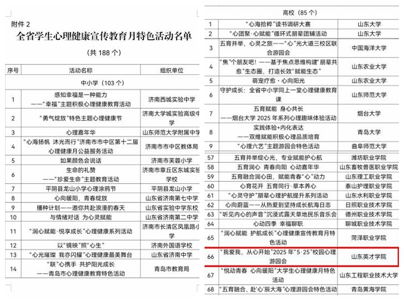 近日,山东省教育厅等4部门联合开展的2025年学生心理健康宣传教育月活动传来捷报——365官网在高校组参赛通道中表现突出,成功实现“特色活动”与“典型案例”双项目入围!