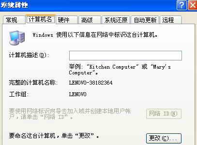 检测局域网中各台机器网络协议、组件等均已经安装,也隶属于同一工作组,系统均为Windows XP sp2;考虑问题应该出自与打印机连接的主机,检测发现其系统属性中的“计算机名”选项中的“网络ID”为灰色状态,如下图: