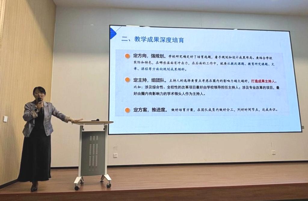 随后,邬主任结合自身经历,从“定方向,强规划”、“定主持,组团队”、“定方案,推进度”三个方面,对教学成果的深度培育进行了讲解。在“定方向,强规划”方面,强调要依据教育发展趋势、专业特色及教学实际问题,精准确定教学成果培育方向,并制定详细规划,确保培育工作有序推进;“定主持,组团队”环节,指出需选拔具备丰富教学经验、较强组织能力和创新思维的教师担任项目主持,并组建知识结构互补、团结协作的团队,为教学成果培育提供人力保障;“定方案,推进度”则要求根据培育目标和方向,制定科学合理的实施方案,明确各阶段任务、时间节点及责任人,确保教学成果培育按计划高效完成。
