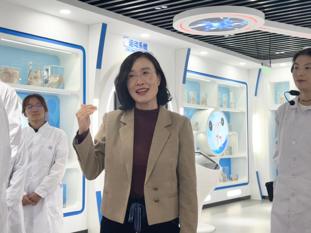 9:30,生命科学馆实行“零扩音”模式。中心主任王辉、徐莉带领学生讲解团,以耳语式教学介绍头颈、胸腹标本结构与临床关联,5分钟静默环节仅闻心跳监测仪“滴——”声,向“无语良师”致以最庄重的敬意,完成“入学第一次生命教育”。